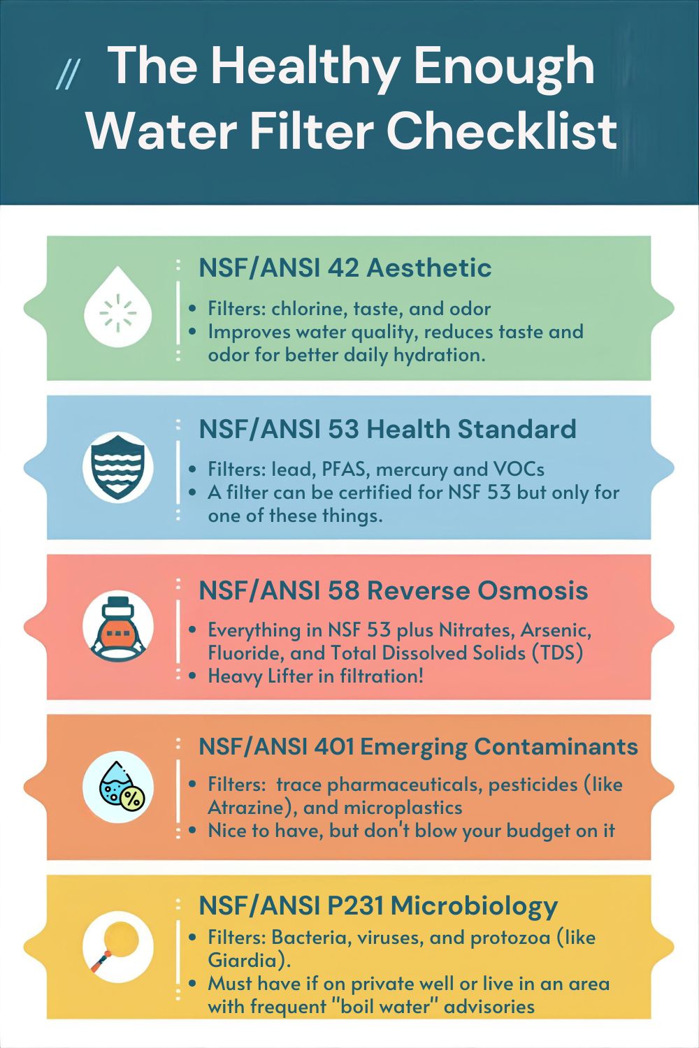 The nuance most people miss: "NSF tested" is not the same as being certified to a specific standard. A filter certified only for taste (NSF 42) is not appropriate if you need lead or PFAS reduction (NSF 53/58).